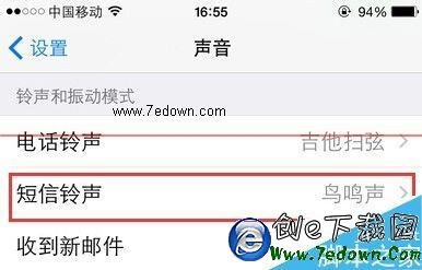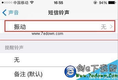 5、這時,進入短信鈴聲的設置頁面,可以看到這裡的振動模式顯示無,表示新消息來了,也不會進行振動提醒,我們點擊打開