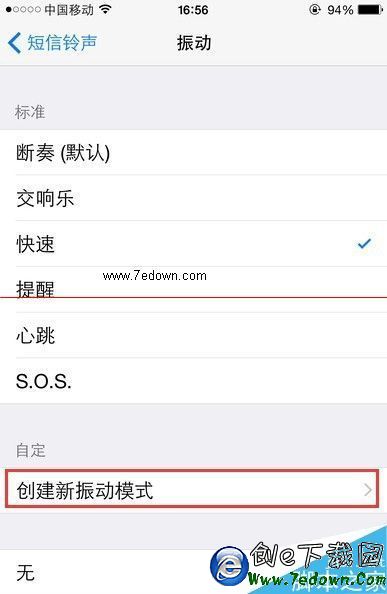1、當然,我們除了系統自帶的振動方式之外,還可以點擊新創建振動模式選項,自己DIY振動的次數以及振動時間的長短