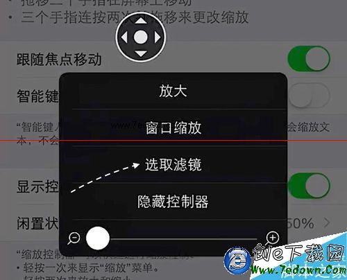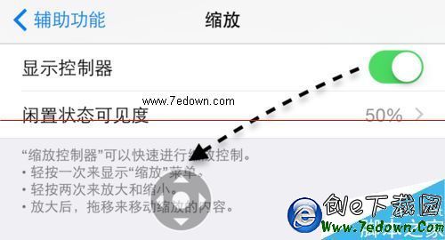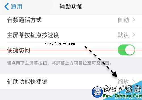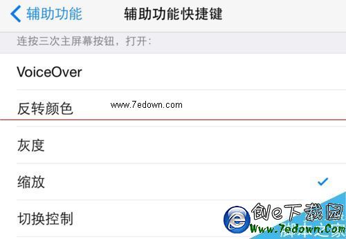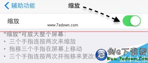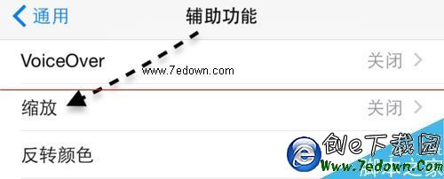 2、隨後請在列表中選擇“縮放”選項,然後我們就可以通過連續按下三次“主屏Home”按鈕來打開或關閉“弱光”效果,達到控制屏幕亮度的目的。