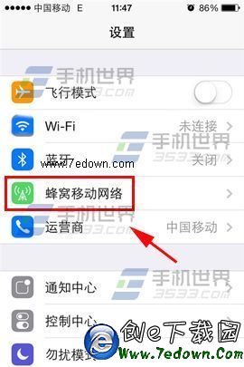 打開iPhone6手機【設置】,點擊【蜂窩移動網絡】,進入後可根據所需開關聯網軟件。(如下圖)