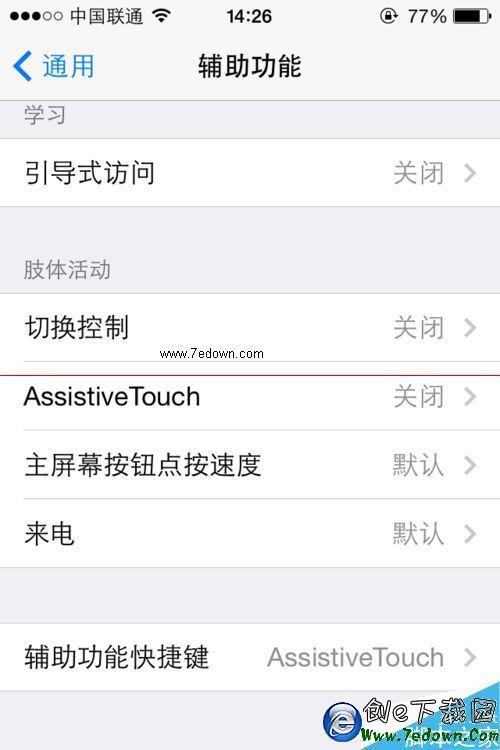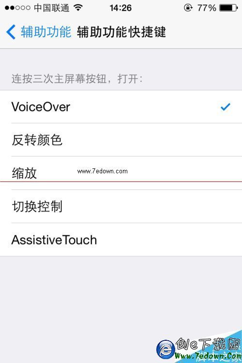 5、我們開可以使用設置裡面的另一個功能來快捷打開這個語音播報(VoiceOver)的功能可以隨時關閉和打開方法如下,設置=》通用=》輔助功能=》最下面的“輔助功能快捷鍵(VoiceOver)”