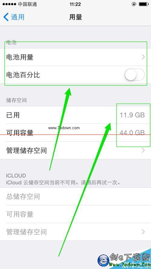 第四步,進入“用量”後,如箭頭所示就可以設置“電池百分比”和查看手機內存以及當前內存了。