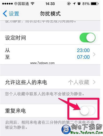 4、在這裡把定時勿擾模式的時間進行取消關閉,把下面的重復來電開關進行打開。