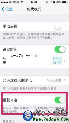 5、這裡的重復來電開關打開後如上一個電話沒有注意,沒有接到,那麼打開重復第二次三分鐘內這個開關,在他三分鐘時間內再次撥打你手機,鈴聲就會想起來。完成設置。