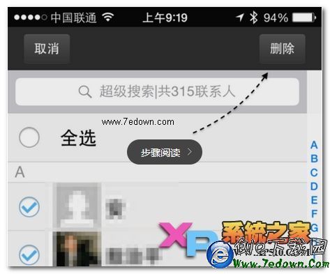 接下來我們可以選擇二個、三個或多個聯系人,當然你也可以選擇所有的聯系人,選擇好以後請點擊“刪除”按鈕。