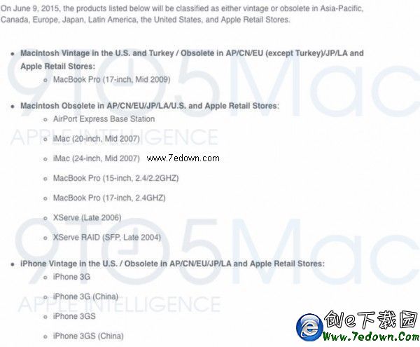 今年6月,轉變為陳舊狀態的 Mac 包括:MacBook Pro(17寸,2009年中期)、iMac(20寸,2007年中期)和 iMac(24寸,2007年中期)。這些 Mac 將無法在在亞太地區/加拿大/歐盟地區/日本/拉丁美洲提供維修支持。