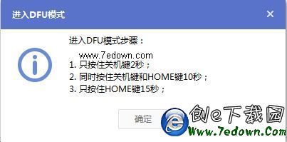 一、打開iTunes,斷開iOS設備與電腦的連接。長按【Home鍵】+【電源鍵】8秒強制關機 -- 關機後長按【Home鍵】鍵8秒--通過USB數據線連接電腦,或者請把設備鏈接電腦,先按住【電源鍵】2~3秒,然後繼續同時按住【電源鍵】和【Home鍵】,持續到第10秒的時候,請立即松開【電源鍵】,並繼續保持按住【Home鍵】,直到在電腦上看到識別到DFU狀態下的USB設備時就進入到DFU模式了,這個時候iTunes會自動或者手動啟動。
