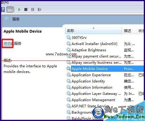3、在右側的服務中找到【apple mobile device】,選擇啟動服務