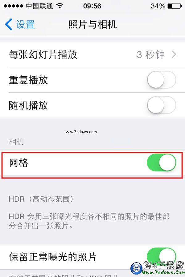 三、然後進入到照片與相機設置界面,找到“網格”一項,點擊右方的滑塊開啟該功能。如下圖所示。