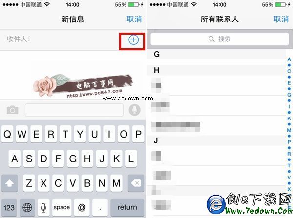 二、在iOS8短信編輯界面中,輸入收件人的電話號碼或者直接點擊一下“+”按鈕,從聯系人當中選擇一位收件人電話,如下圖所示: