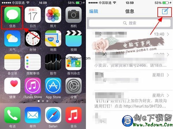 一、在iOS8主界面找到“消息”應用,點擊進入到短信界面,找到“編輯”按鈕圖標,點擊進入,如圖所示。