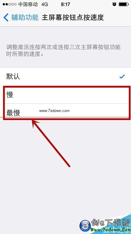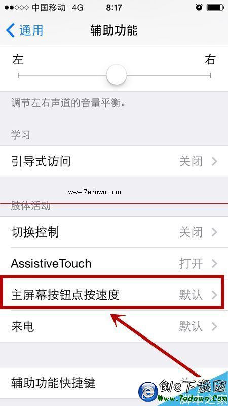 4、彈出界面,下拉菜單中找到“主屏幕按鈕點按速度”,如圖: