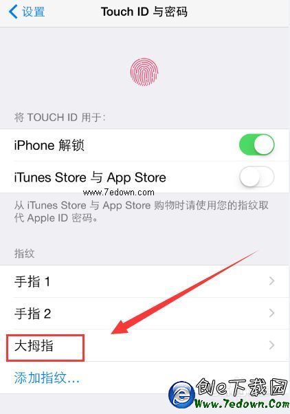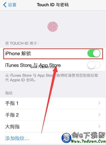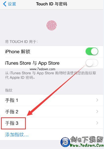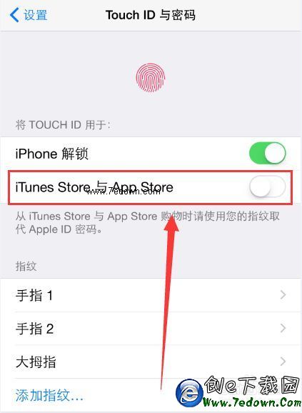 如果打開【iTunes Store與App Store】選項的按鈕,則在使用這兩項服務的時候就會要求輸入指紋。這根據您自己的需要來進行設置。