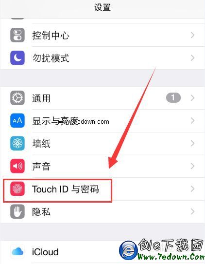 首先在蘋果手機桌面上打開【設置】圖標,然後在打開的列表裡找到【Touch ID 與密碼】選項並且點擊進入。如下圖所示。