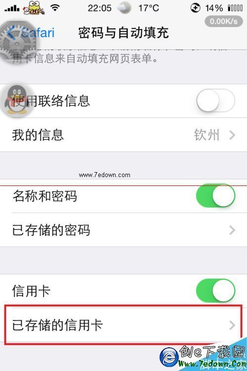 4.打開信用卡開關,然後點擊已存儲的信用卡