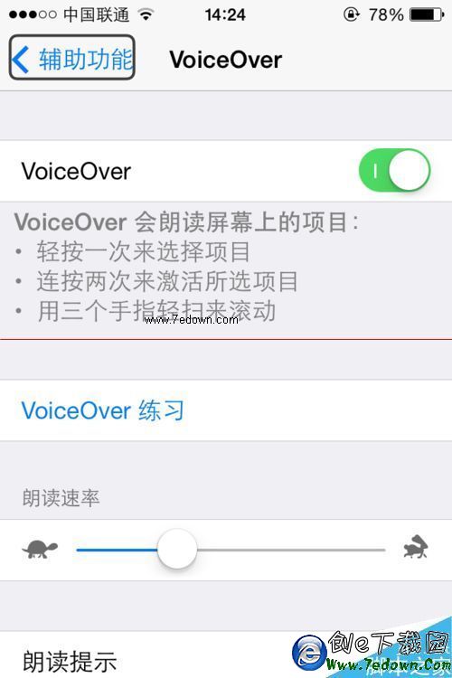 6、打開這個輔助功能快捷鍵(VoiceOver)就會出現下面的界面把第一個選項勾選上就可以了下次連按三次主屏幕按鍵就會出現這個功能再按三次就取消這個功能是不是很方便呢。
