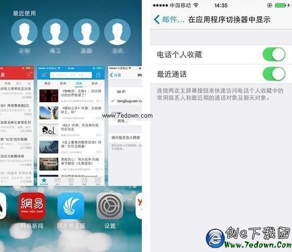 在iOS8的程序後台切換界面,頂部加入了聯系人的顯示,默認顯示最近聯系人,向左滑動還可以顯示收藏聯系人,點擊聯系人還可以直接撥打電話或者發送短信。