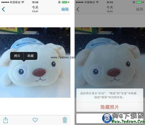 iOS8提供了隱藏照片的選項,不過並不是徹底地隱藏。進入相簿,長按某張照片,就會出現“隱藏”的選項。不過,隱藏的照片卻不會從相簿消失,而是在“年度、精選、時刻”中看不到了。所以,如果有人翻閱相簿,還是可以看到你的照片,這個功能顯得有些雞肋。