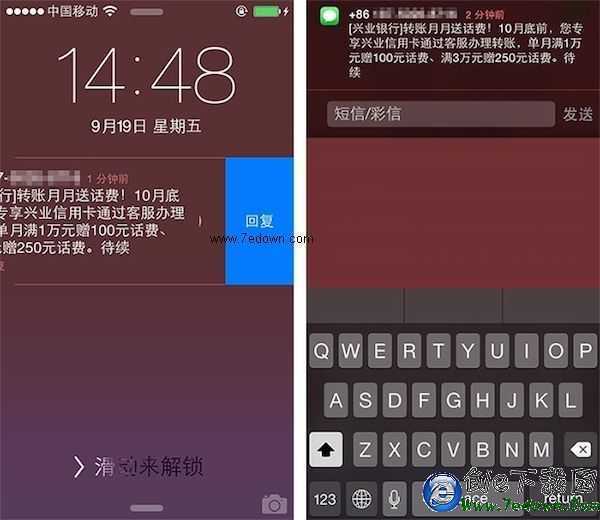 收到新短消息時,在鎖屏界面直接向右滑動信息,就會出現回復選項,不用解鎖就能方便地回復短信了。