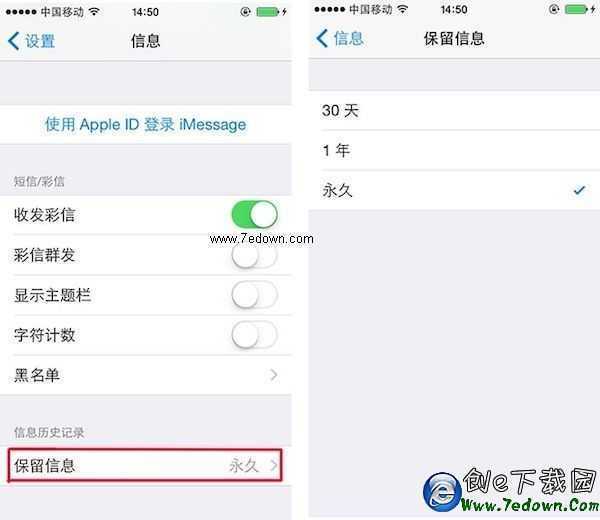 手機裡滿滿都是垃圾短信,時間長了短信數目太多,手動刪除太麻煩,不刪除又太雜亂。iOS8裡提供了自動刪除歷史短信的設置,“設置 >”——“信息”——“保留信息”中選擇短信的保留時間,支持自動刪除30天或1年前的歷史短信。