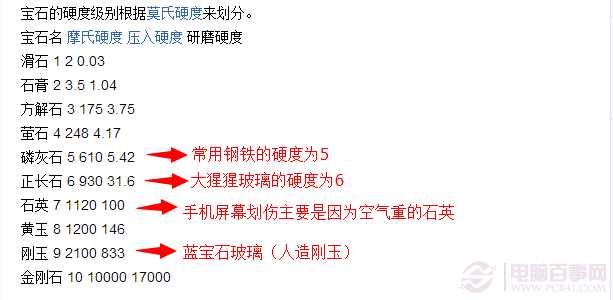在這裡我們要說明一下莫氏硬度的問題,在硬度排名中,硬度高的物體可以輕易在硬度低的物體上留下痕跡,而硬度低的物體則很難劃傷硬度高的物體,從圖中我們可以看出,為什麼明明手機屏幕用的大猩猩玻璃可以不懼鑰匙而卻會被空氣中的沙子劃傷。