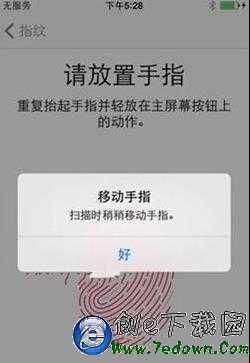 4、開始設置指紋,將手指放在Home鍵上,指紋不會一次就完成設置,需要根據提示重復動作,放置後再抬起手指,然後再放置。