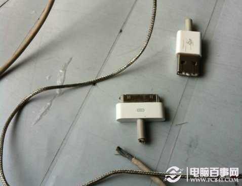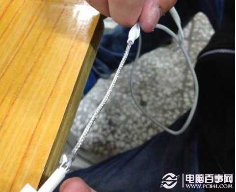 而這層外包的金屬網會一直延伸到數據線接頭的保護橡膠圈內。但是由於四根導線分別焊接在數據線接口的不同位置,因此在導線分開後,金屬網便不能再保護導線。