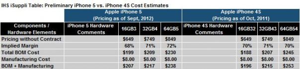 從上面的的詳細成本列表中我們可以看出,64GB iPhone5 實際成本比上一年同容量的iPhone4S要少15美元。而另外兩個型號的版本要稍微高一些,其中32GB iPhone5比同容量的iPhone4S的要高2美元,16GB的要高11美元。
