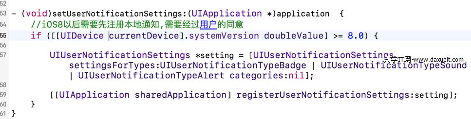 此處需要注意的是自從iOS8之後需要征求用戶的通知,如果同意則創建UIUerNotificationSettings,然後 registerUserNotificationSettings。對本地通知的數量限制,iOS最多允許最近本地通知數量是64個,超過限制的本地通知將被iOS忽略。
