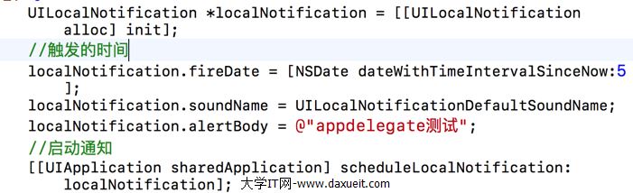 在需要使用本地通知的控制器定義,這裡為了簡便直接定義一個5s之後的鬧鐘,可以改成任意一個時間點的,轉換成NSDate類型替換[NSDate dateWithTimeIntervalSinceNow:5]即可。