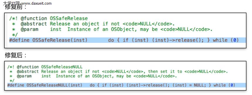 1. CVE-2015-6974 IOHIDFamily 內核漏洞:該漏洞存在於IOHIDResource這個內核服務中,在terminateDevice後,系統沒有將device設置為NULL, 從而造成UAF漏洞。該漏洞在盤古iOS 9.0越獄中被使用,利用該漏洞可以做到內核的任意讀寫,並完成非完美越獄。需要注意的是,該內核服務並不能在沙盒內直接訪問,所以想要利用該漏洞,需要先做到沙盒逃逸。