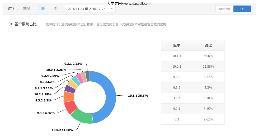 根據某專業移動分析平台2016年12月的數據可以看到,僅有3.28%的設備更新了最新版的iOS 10.2。這意味著96.72%的設備都有被最近剛發布的mach_portal漏洞攻擊的風險。我們相信,在新的一年,iOS的漏洞數量還會持續增加,並且隨著漏洞利用技術的公開,黑灰產也極有可能利用漏洞對用戶進行攻擊,希望廣大用戶一定要注意自己iOS設備的安全。