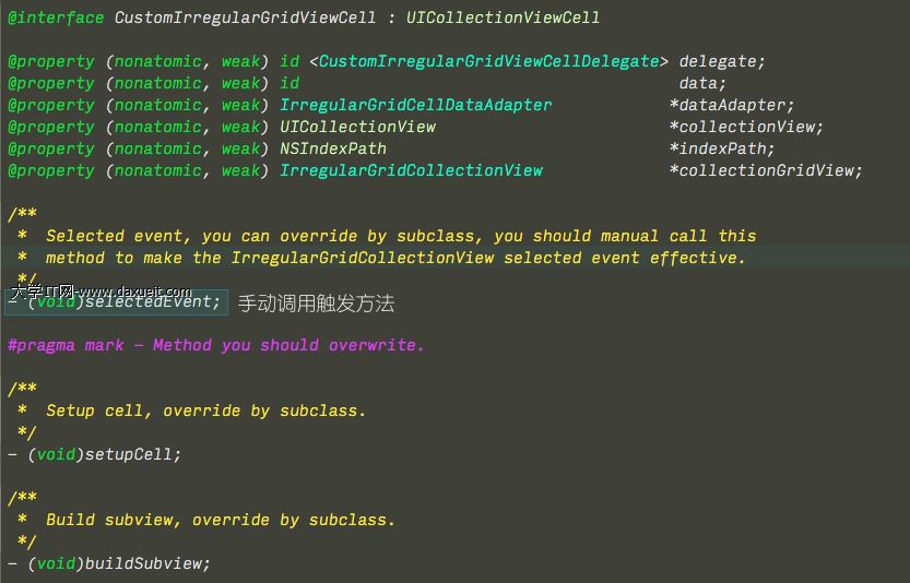 - (void)irregularGridCollectionView:(IrregularGridCollectionView *)irregularGridCollectionView didSelectedCell:(CustomIrregularGridViewCell *)cell event:(id)event;