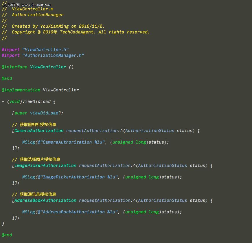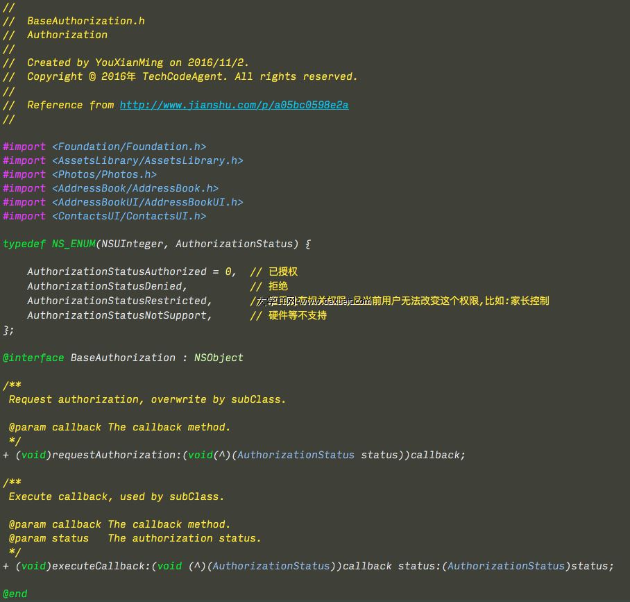 這是本人寫的一個工具,用以便利的處理各種權限獲取的操作,目前提供相冊、照相機、通訊錄的權限獲取操作,參考了 http://www.jianshu.com/p/a05bc0598e2a 的源碼並進行了部分修改。