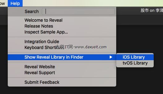 我們Mac上的Reveal自帶了兩個庫,一個是libReveal.dylib,一個是Reveal.framework。在未越獄的設備上使用庫是後者,本篇博客中使用的是前者。這兩個文件位於Reveal中的iOS Library中。Reveal菜單->Help->Show Reveal Library in Finder ->iOS Library。通過上述目錄就可以找到我們需要的文件,當然本篇博客中我們只需要libReveal.dylib這一個文件。