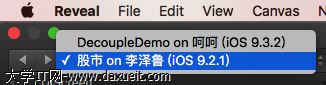 上面Reveal的配置工作就以及配置好了,接下來的時間就是Reveal的使用時間了。Mac上Reveal查看設備上App的UI層級時是不需要使用USB進行連接的,但要保證你的iOS設備與你的Mac在同一個局域網內。下方這個截圖就是我在使用Reveal時的一個截圖,DecoupleDemo on 呵呵(iOS 9.3.2)這個設備是我一個同事的,當然他的手機是未越獄的設備,不過他的App中引入了Reveal.framework這個包,所以我在這邊也是可以看到的。下方是我的越獄設備,當然這個“股市”App是iOS系統自帶的App, 接下來就看一下如何去使用Reveal在越獄設備上來查看第三方App的UI層級。