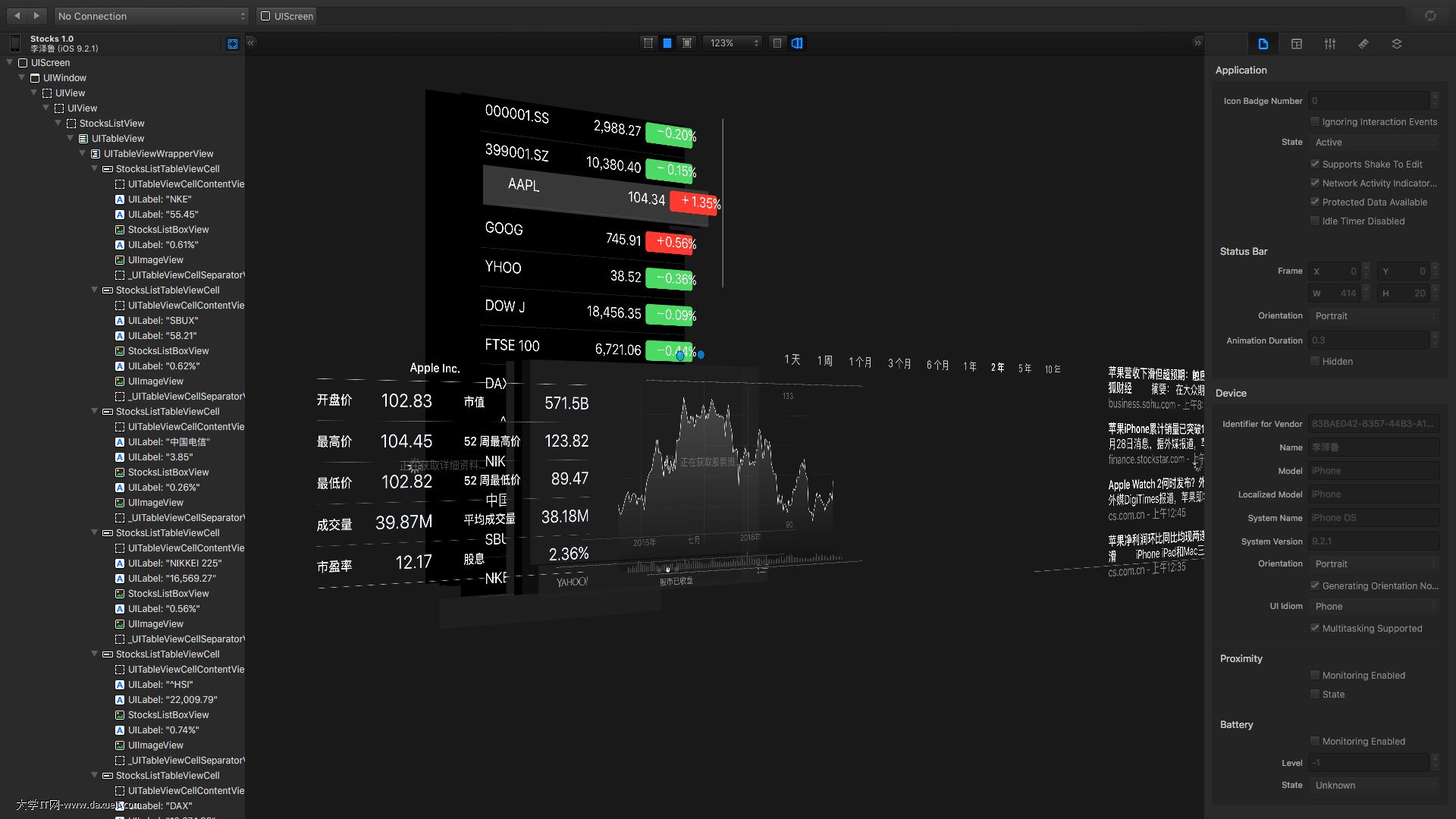在上方截圖中,我們點擊下方的股市這條就可以Reveal“股市”這個App了。下方就是“股市”這App的UI層級圖。
