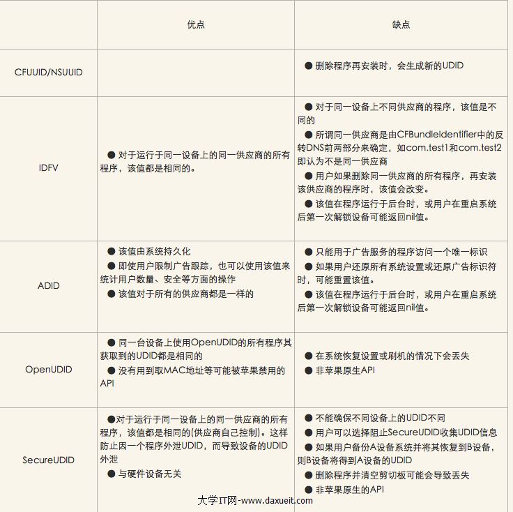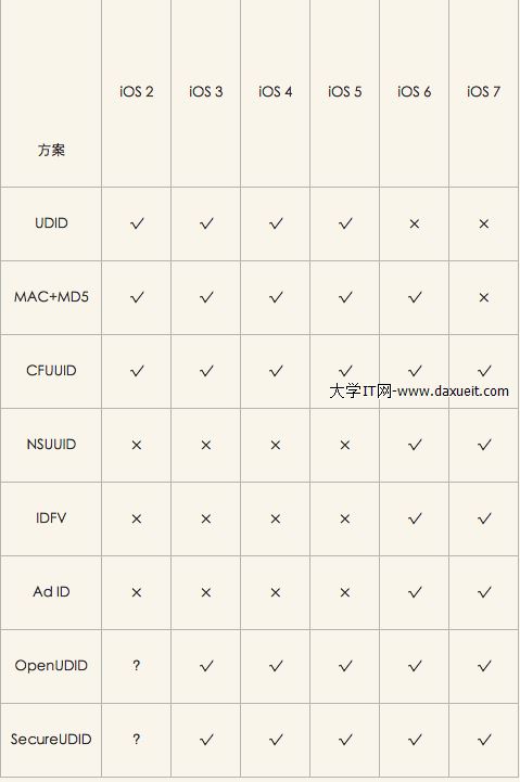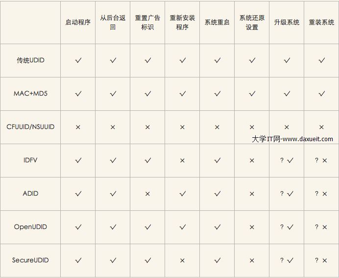 √表示能夠保證UDID的持久化, ×表示該情況下UDID可能會丟失改變,?表示該種情況沒有實際驗證過,純屬猜測(畢竟升級系統什麼的太麻煩) 優缺點