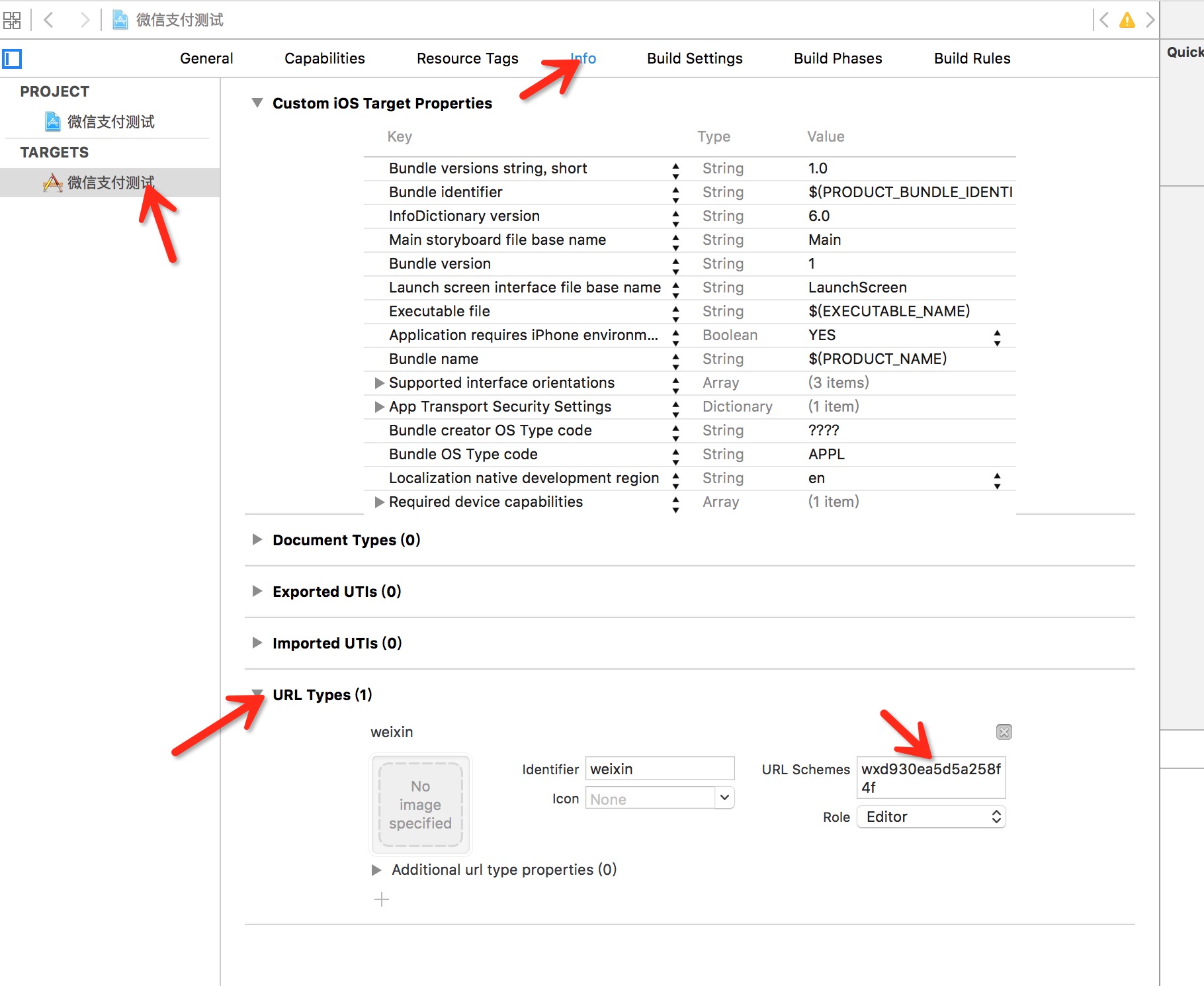 在注冊微信平台APP的時候,會給一個唯一識別標識符(APPID),在APP端開發步驟裡面說得很清楚了,需要填在URL Schemes這個地方,