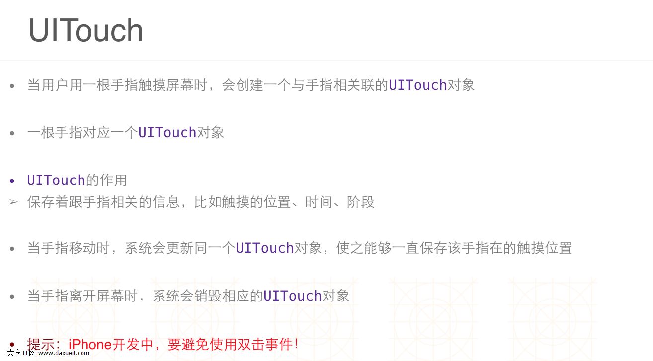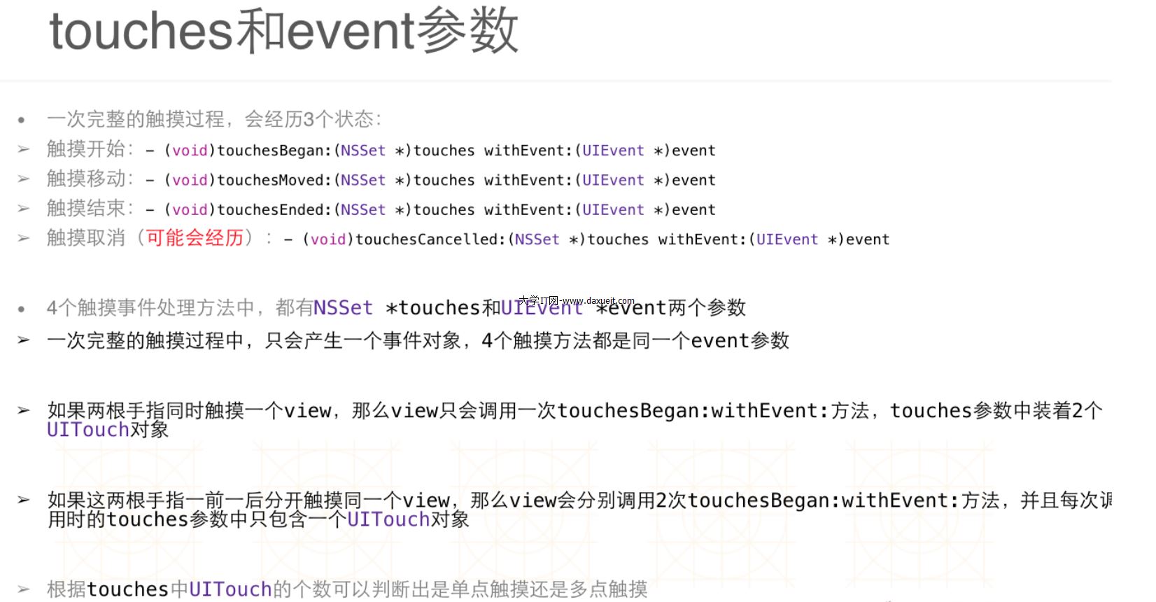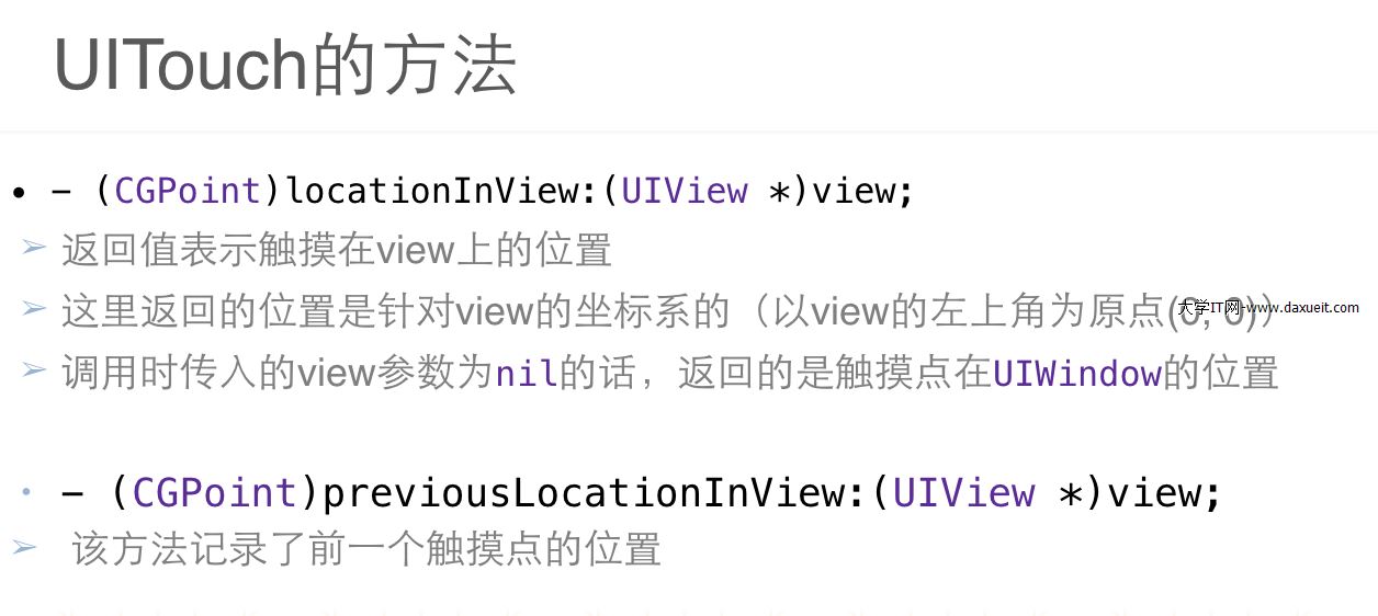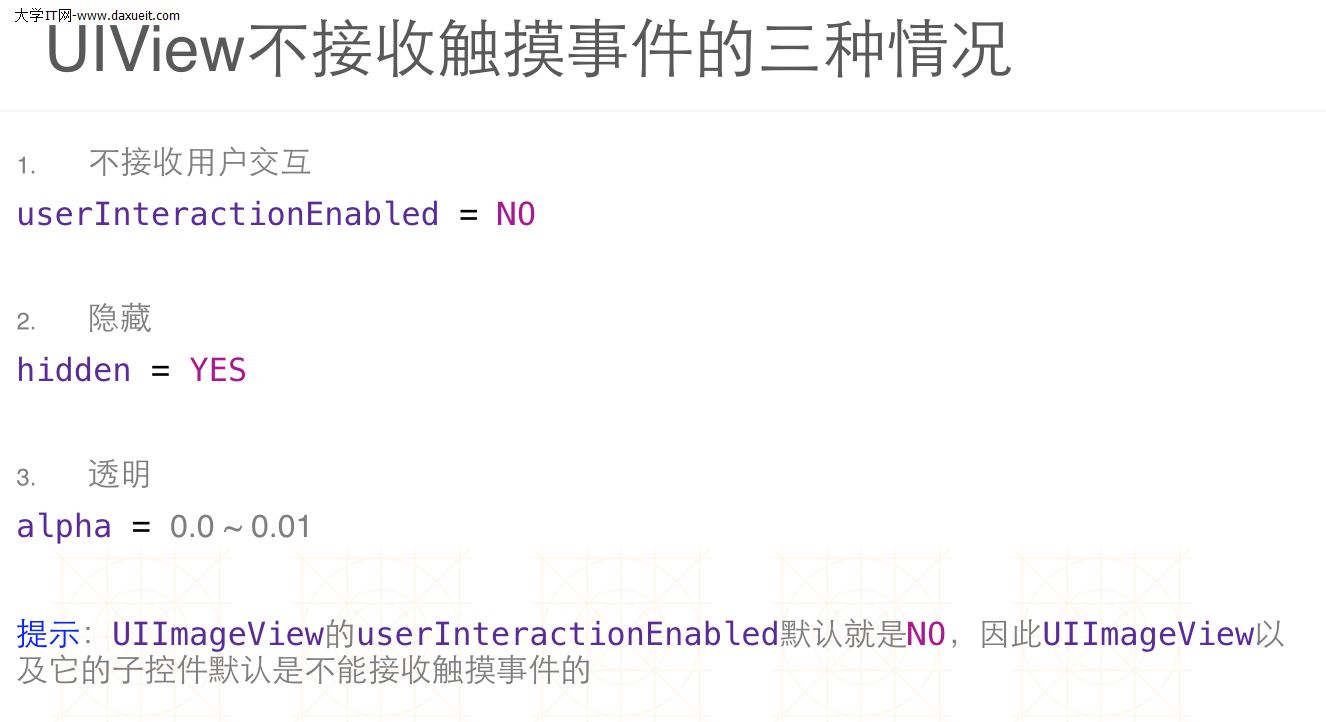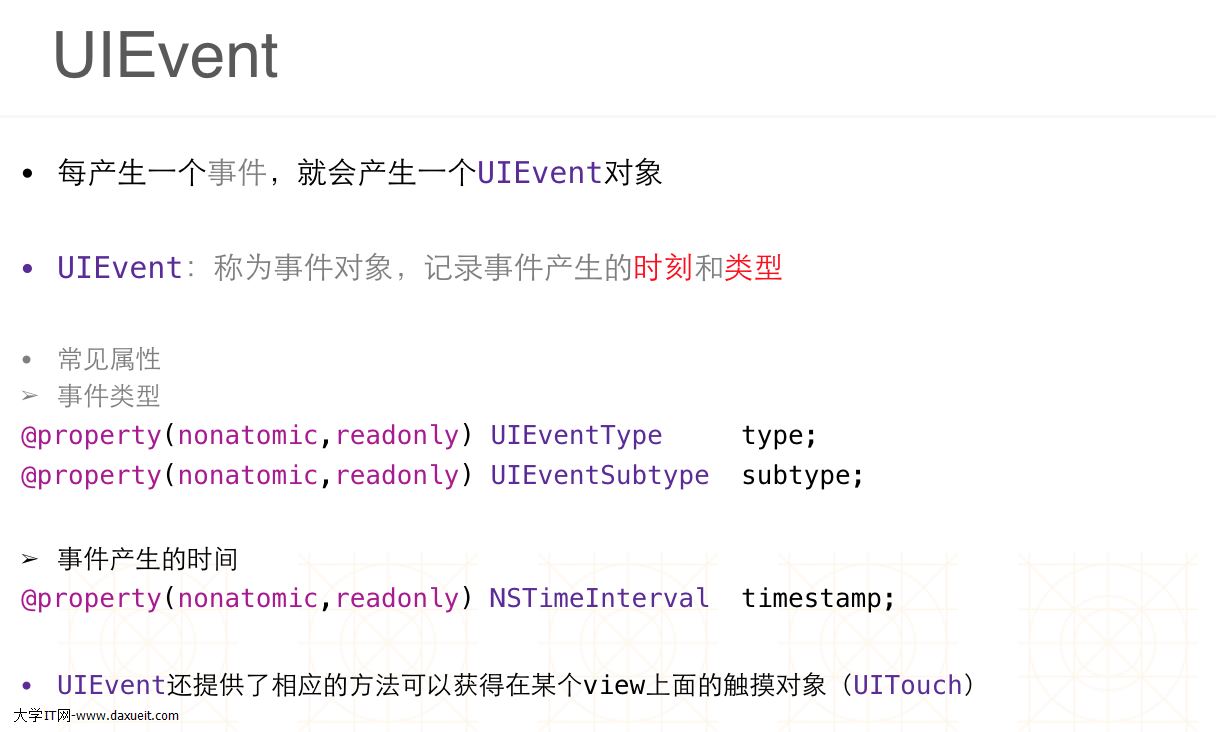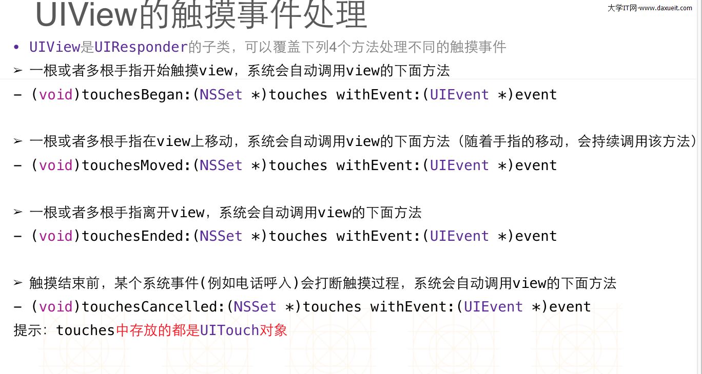 UIApplication、UIViewController、UIView都繼承自UIResponder,因此它們都是響應者對象,都能夠接收並處理事件