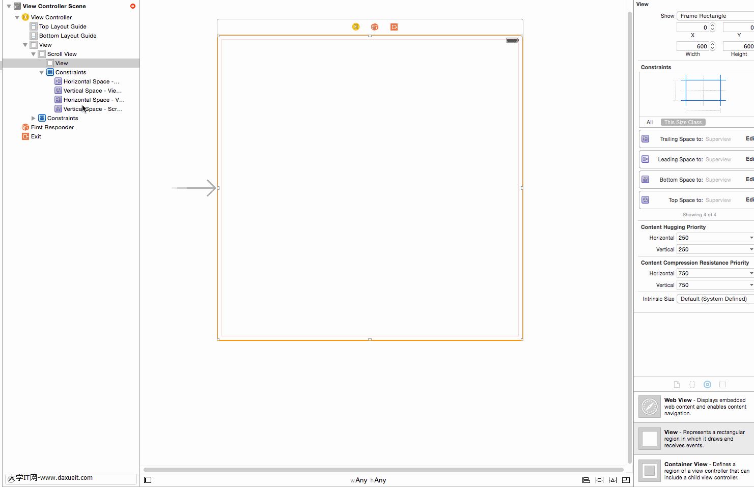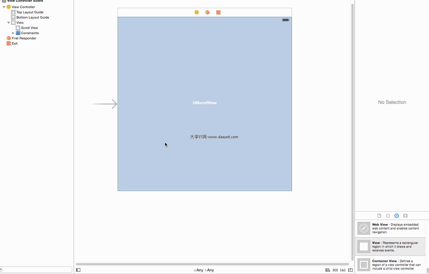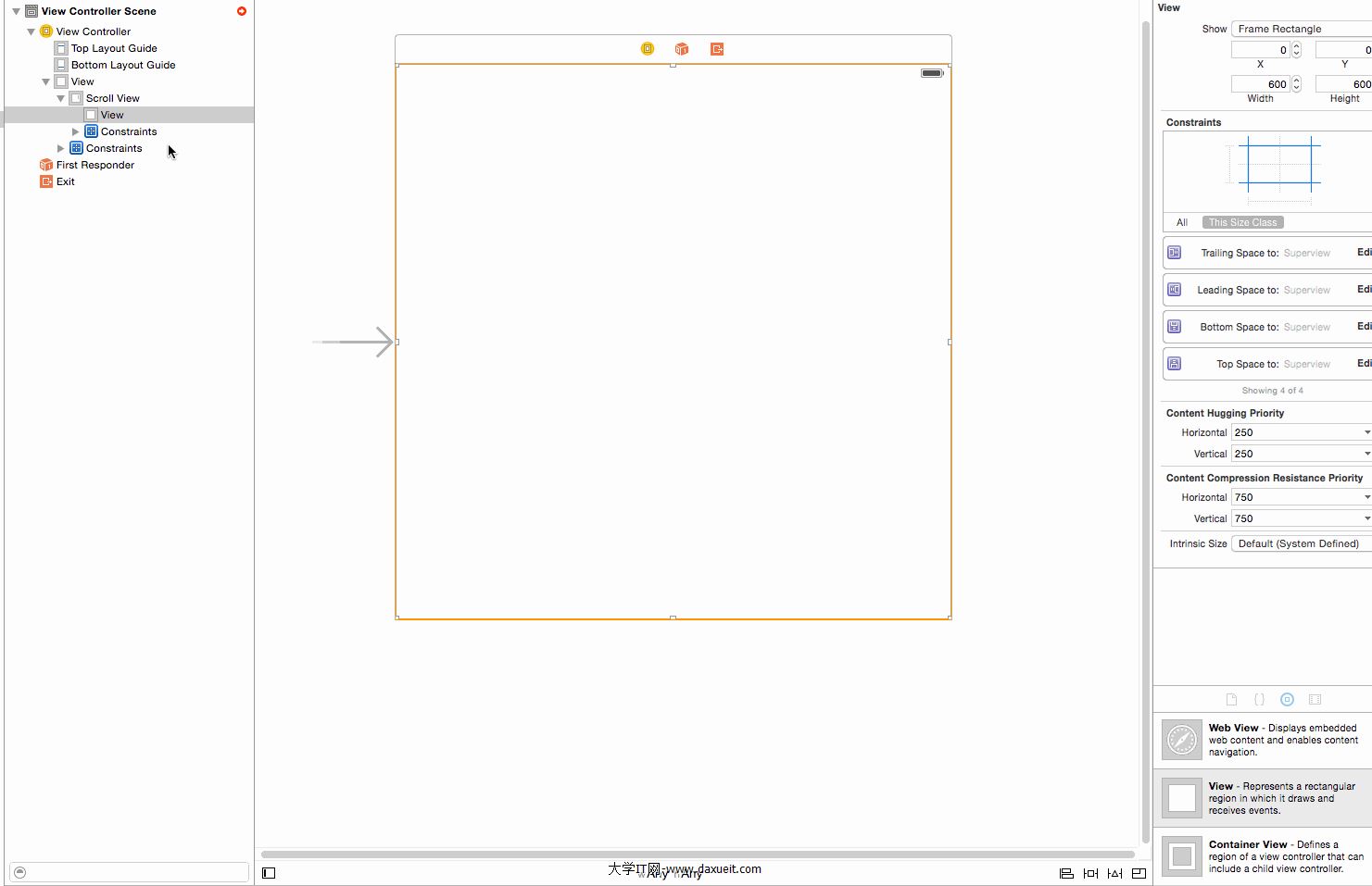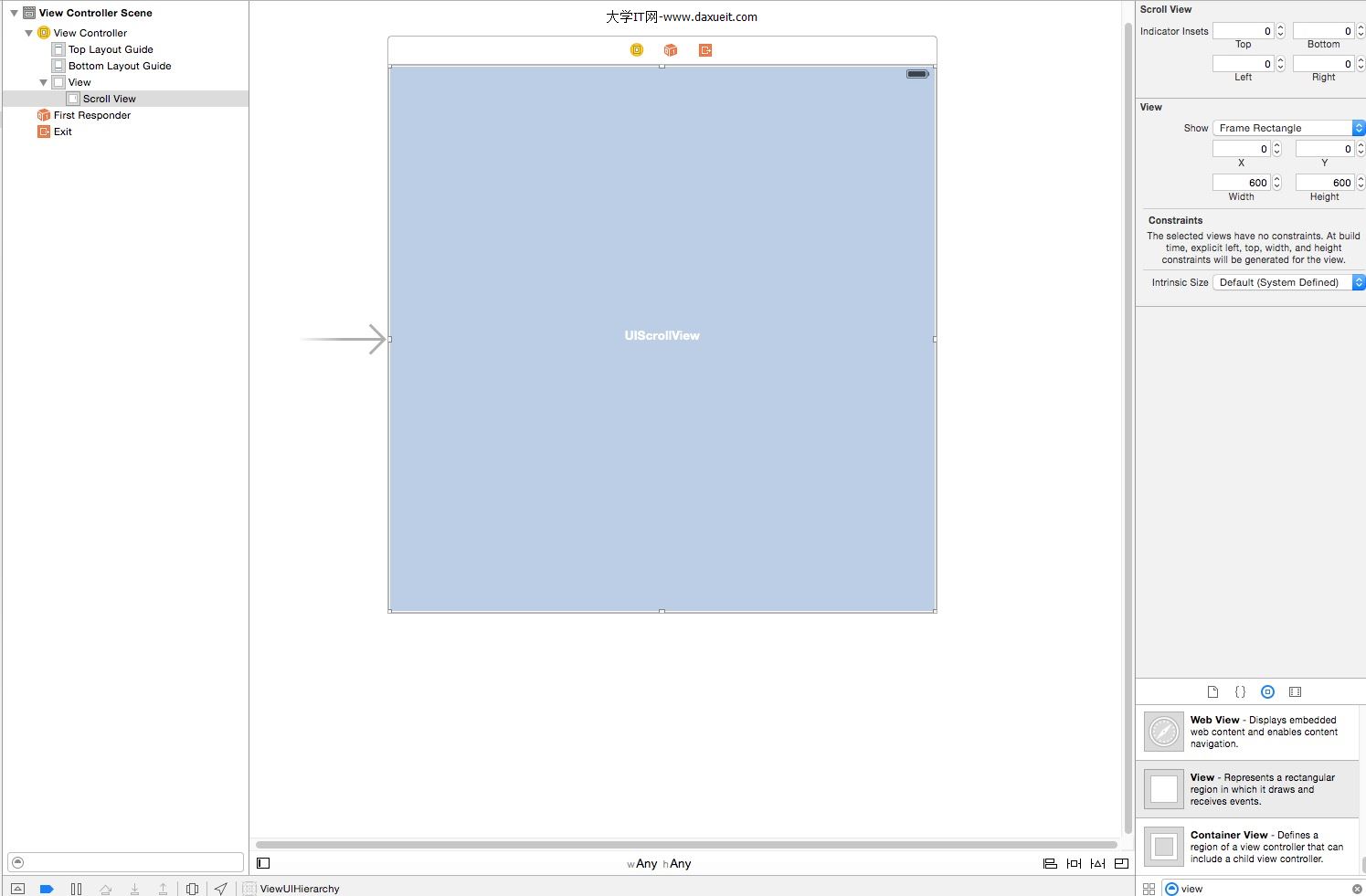 1. 創建一個項目,拖拽一個ScrollView到故事板中,如下圖