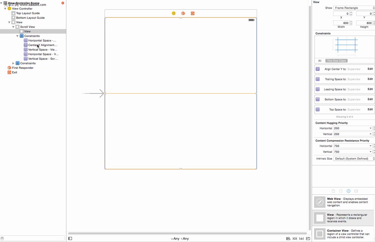 在使用storyboard和xib時,我們經常要用到ScrollView,還有自動布局AutoLayout,但是ScrollView和AutoLayout 結合使用,相對來說有點復雜。根據實踐,我說一下我的理解,在故事板或xib中,ScrollView是根據其下面的一個View的大小來確定ContentSize的大小。
