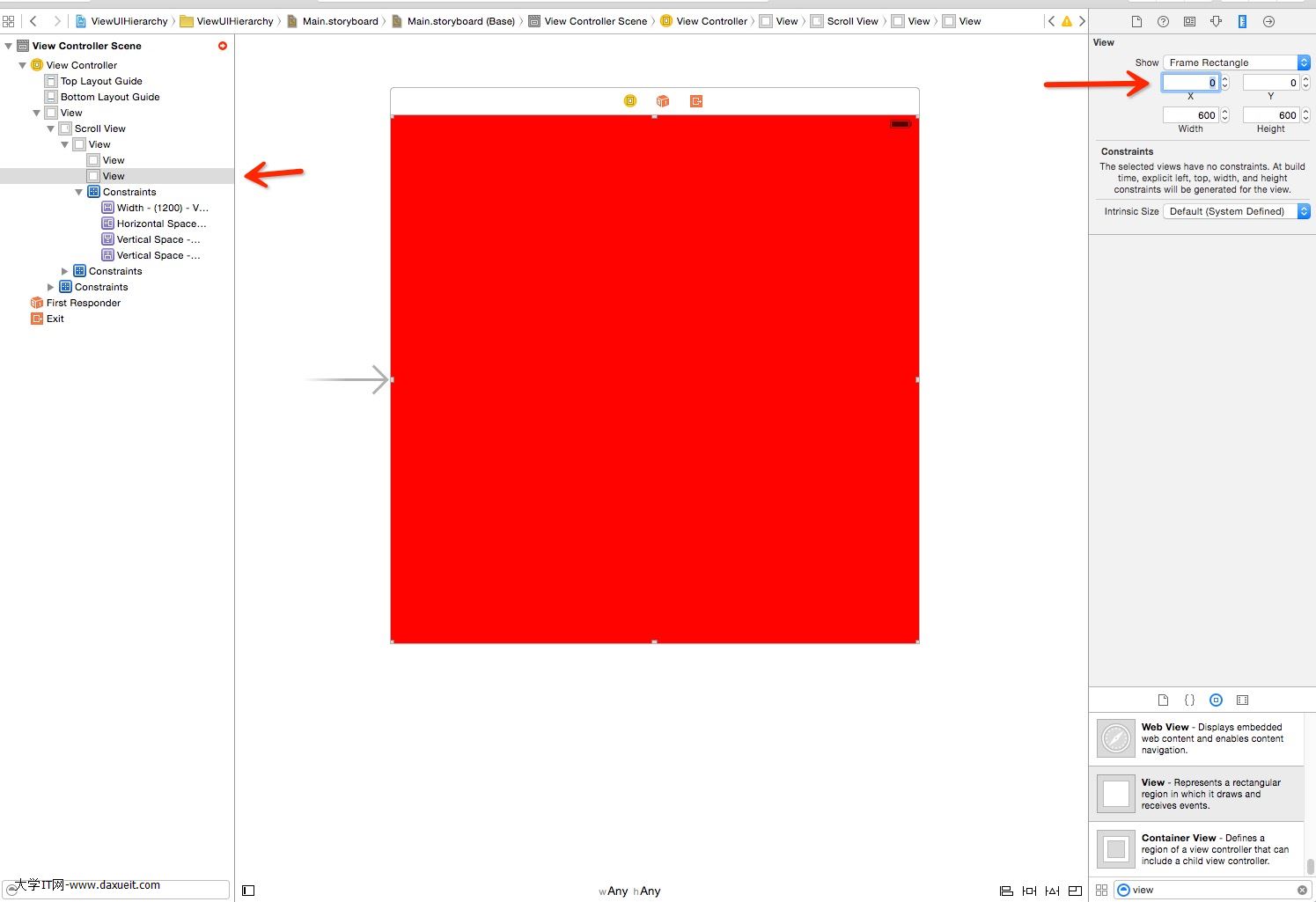 11.再拖拽一個View, 背景顏色設為紅色,設置好之後, 將frame設置到我們需要的, 我這邊將X設置到600。