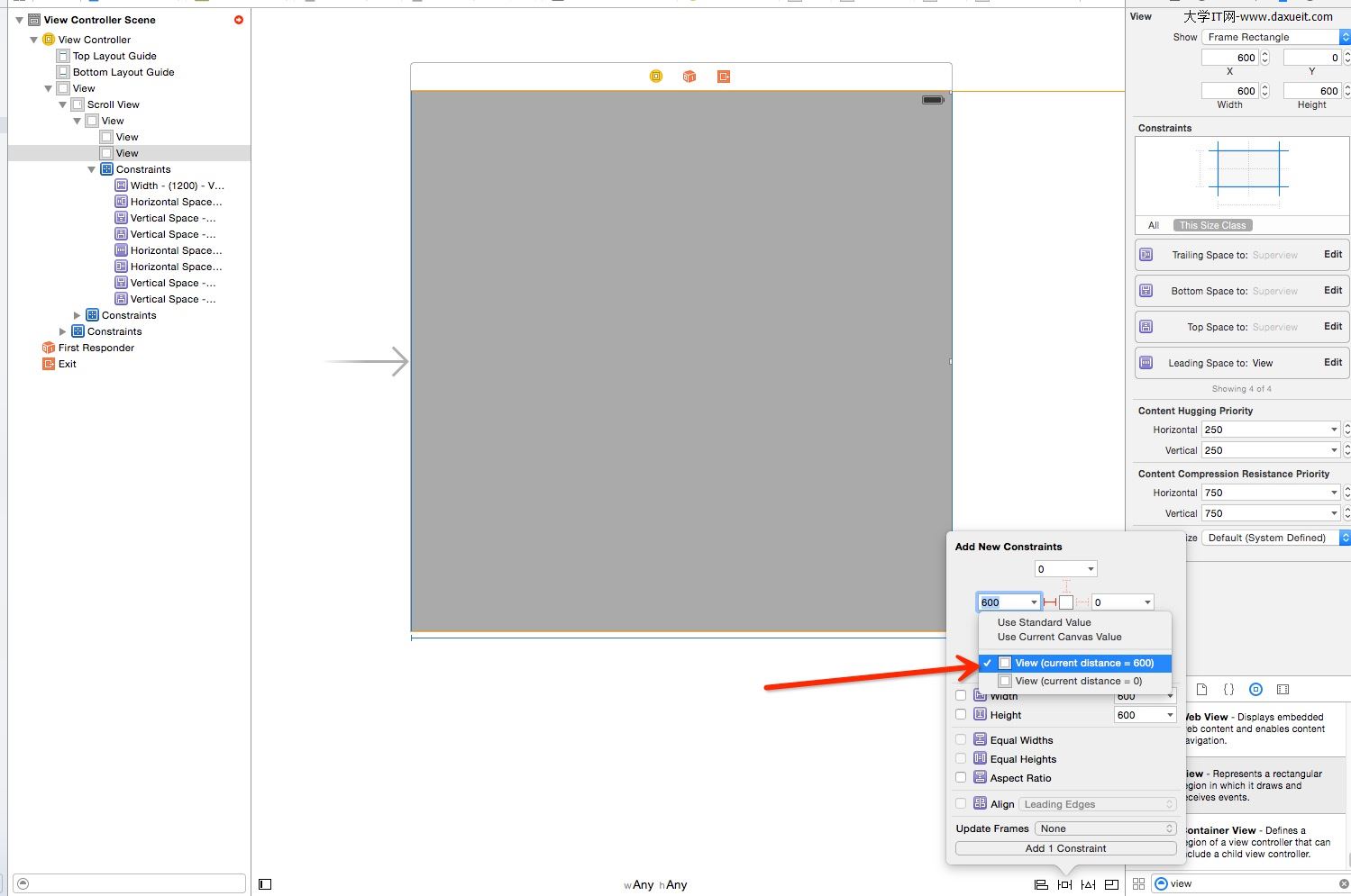6.我們以水平方向滾動為例, 我們需要確定我們想要的寬度, 添加一個固定的寬度的約束。