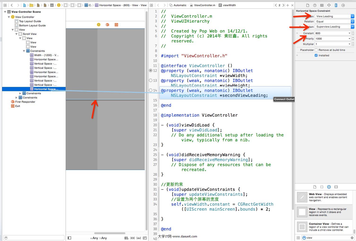 14.然後將這個約束Leading拉成屬性,在- (void)updateViewConstraints設置他的值
