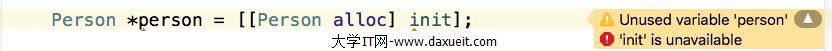 例子: #define UNAVAILABLE_ATTRIBUTE __attribute__((unavailable)) #define NS_UNAVAILABLE UNAVAILABLE_ATTRIBUTE #import <Foundation/Foundation.h> @interface Person : NSObject @property(nonatomic,copy) NSString *name; @property(nonatomic,assign) NSUInteger age; - (instancetype)init NS_UNAVAILABLE; - (instancetype)initWithName:(NSString *)name age:(NSUInteger)age; @end
