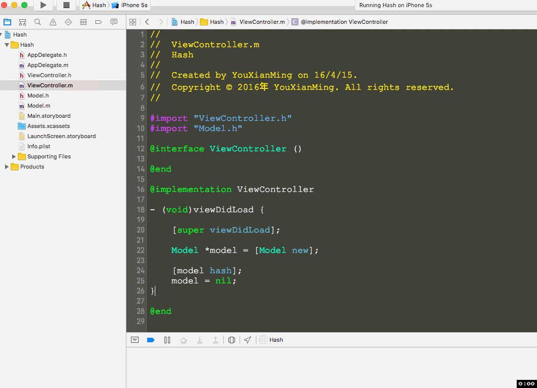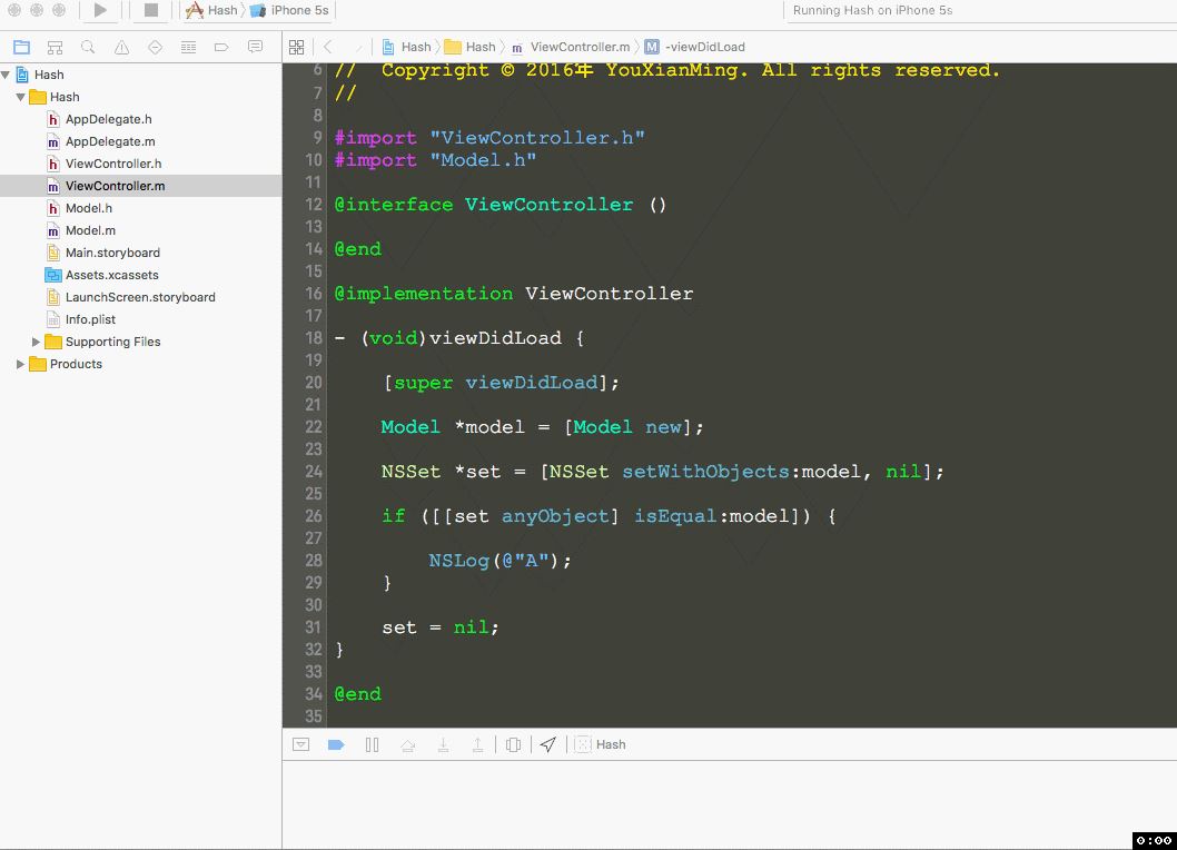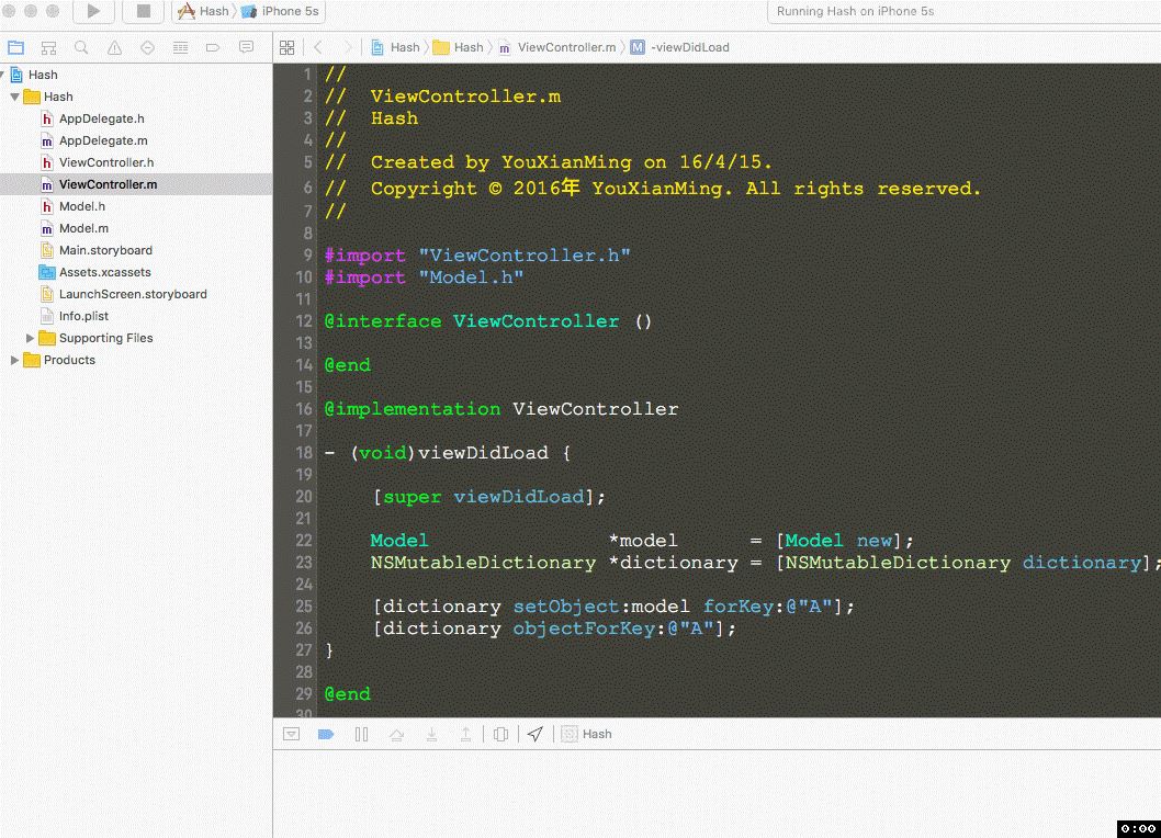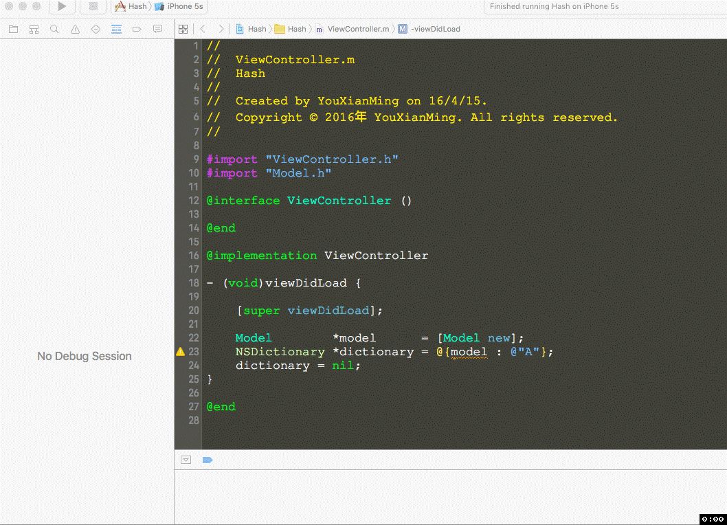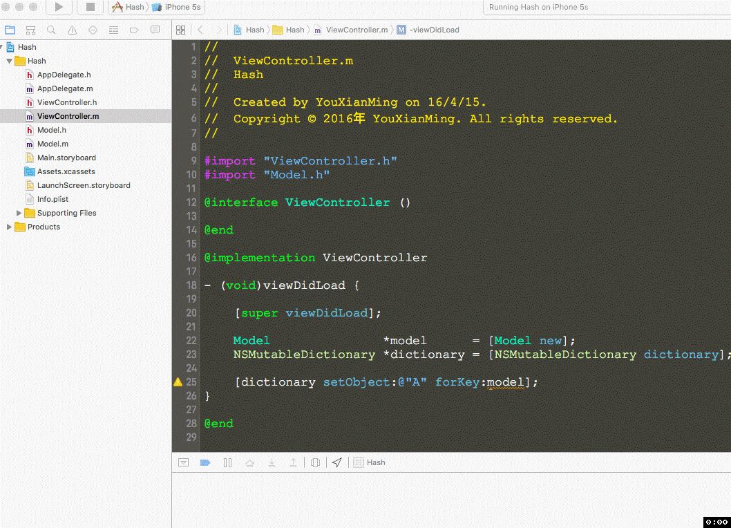 7.用作NSMutableDictionary 中的key 時,hash 方法執行了,不過崩潰了,因為 Model 類沒有實現 NSCopying 協議