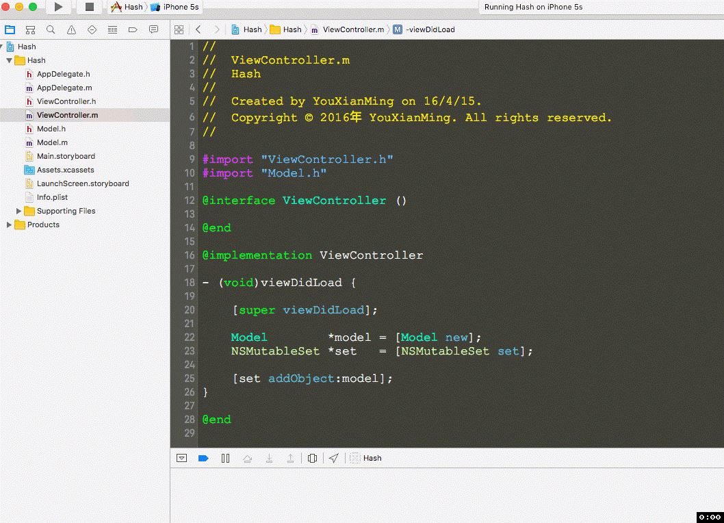 4. 用 NSMutableSet 添加對象,這時候會執行hash方法,至於為何會執行2回_(:з」∠)_ ?