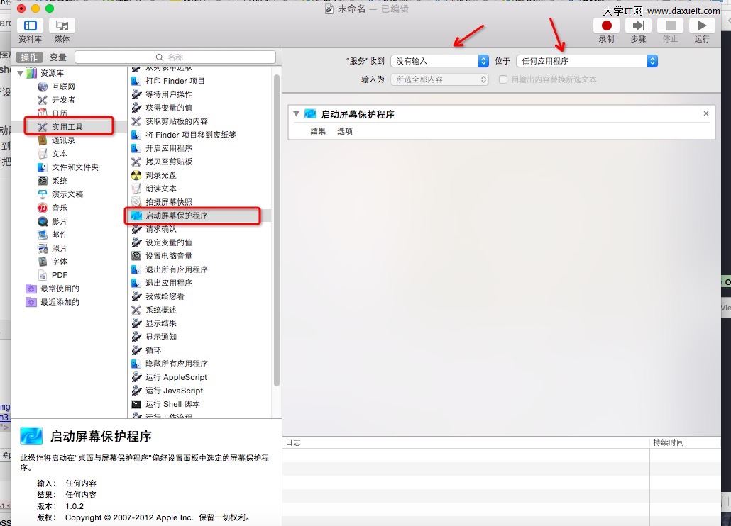 第二步,要用快捷鍵啟動屏幕保護程序,相對復雜一點。在“應用程序”裡找到“Automator”。新建一個服務,在“操作”下的“實用工具”裡找 到“啟動屏幕保護程序”,並把此操作拖動到右邊,並且選擇“沒有輸入”和位於“任何應用程序”,如下圖所示。然後把服務保存為自己定義的名字。