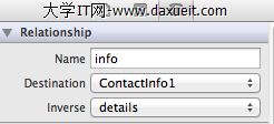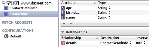 #import <Foundation/Foundation.h> #import <CoreData/CoreData.h> @class ContactDetailInfo; @interface ContactInfo : NSManagedObject @property (nonatomic, retain) NSString * age; @property (nonatomic, retain) NSString * birthday; @property (nonatomic, retain) NSString * name; @property (nonatomic, retain) ContactDetailInfo *details; @end
